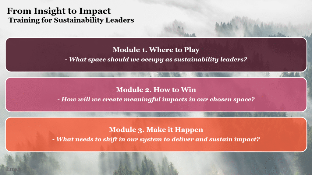 We are excited to launch From Insight to Impact – a strategic training program designed for sustainability professionals who want to sharpen their leadership edge. Over three interactive modules, participants will explore: